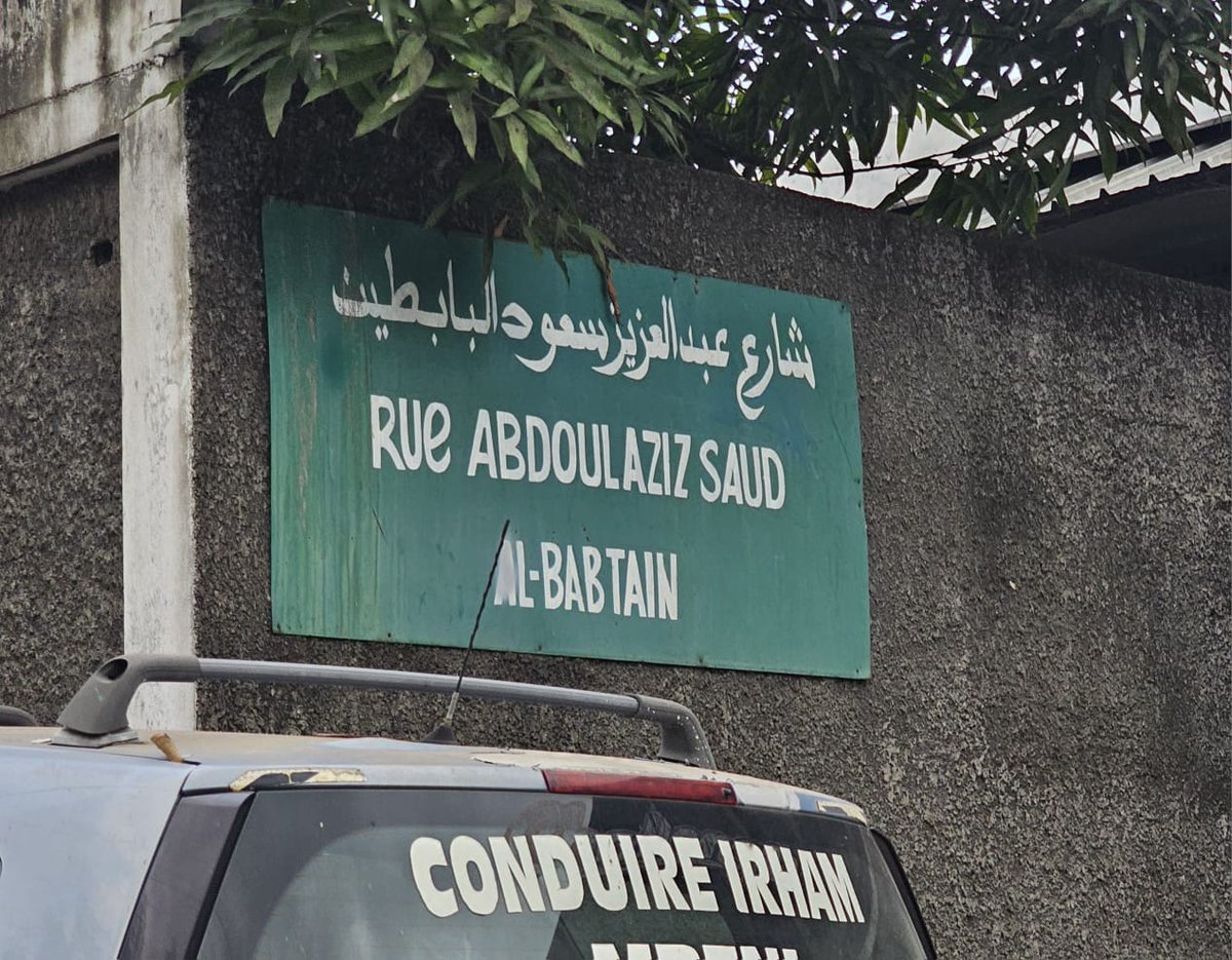 55. أثناء مروري ببعض بلدات جزيرة القمر الكبرى وتحديدًا في بلدة "مبيني" صادفَتْني هذه اللوحة، فسألتُ عنها، فقيل لي: إنها ترمز لهذا الشارع الذي تكفّل بإنشائه الوجيه الكويتي المعروف الأستاذ عبد العزيز سعود البابطين رحمه الله .. x.com