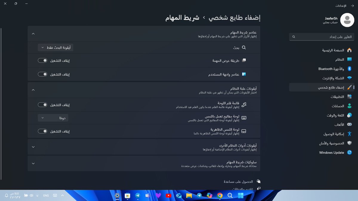 ومن إعدادات شريط المهام تعطيل "عناصر واجهة المستخدم" وتغيير خيار البحث إلى "أيقونة البحث فقط" x.com