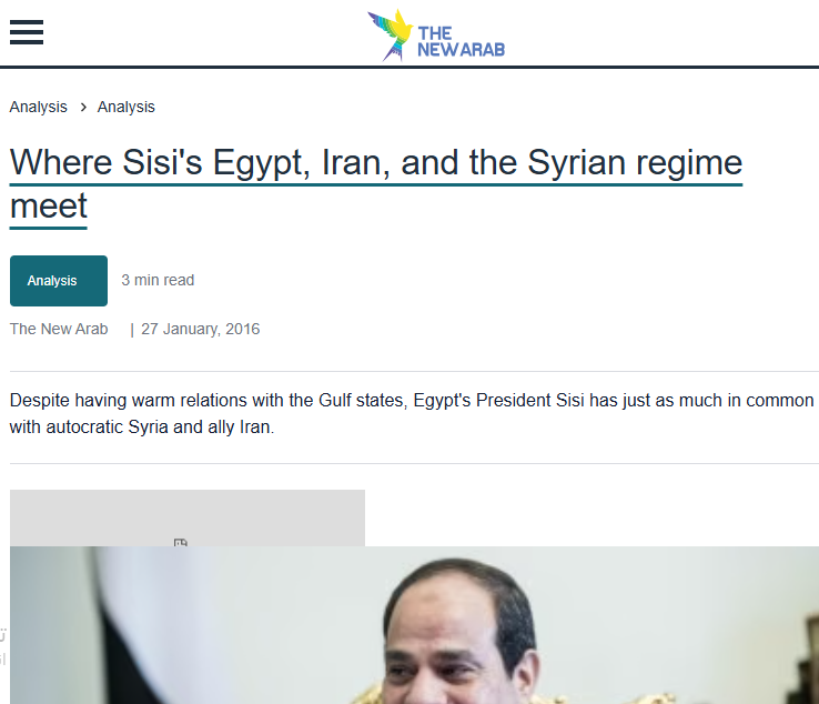 وأشارت الصحيفة البريطانية في تقرير لها بعنوان "إيران تريد مشاركة مصر في محادثات حول سوريا" ان صادق قرباني، الصحافي في وكالة فارس للأنباء، التابعة للحكومة الإيرانية، كتب في حسابه على تويتر تعليقا على قرار مصر دعم الحرب الروسية الإيرانية في سوريا : "من المثير للاهتمام كيف تتحول مصر السيسي تدريجياً من المحور الأميركي السعودي إلى المحور الروسي الإيراني. وربما يكون إحياء العلاقات بين طهران والقاهرة مسألة متى وليس ما إذا كان ذلك سيحدث". ويقول إتش إيه هيلير، وهو زميل في المجلس الأطلسي ومعهد الخدمات المتحدة الملكي في لندن: "إن مصر لديها وجهة نظرها الخاصة بشأن سوريا والتي تتقارب مع وجهة النظر الإيرانية. فالقاهرة تشعر بالقلق إزاء الجماعات الإسلامية. ومن ناحية أخرى، كثيراً ما كانت مصر تغازل الروس، على ما يبدو لإظهار للغرب أن مصر لديها خيارات أخرى. 👇