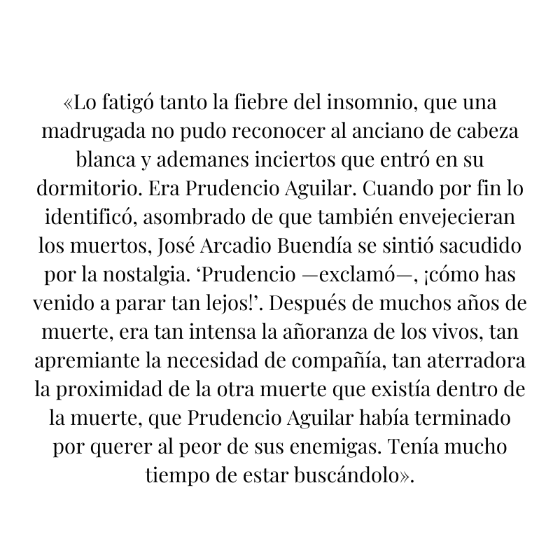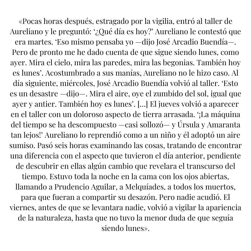 Víctima de las brechas que el tiempo abre con su torpe movimiento, siempre es lunes para José Arcadio Buendía. A partir de ese momento, quedará amarrado a un árbol donde se perderá por infinitos pensamientos, visitará a los muertos y, en su extravío temporal, aprenderá latín.