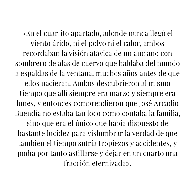 El tiempo en «Cien años de soledad» es el tiempo de nuestra existencia, un tiempo que se derrama tanto hacia el pasado como hacia el futuro. Un tiempo donde se concentra la eternidad.
