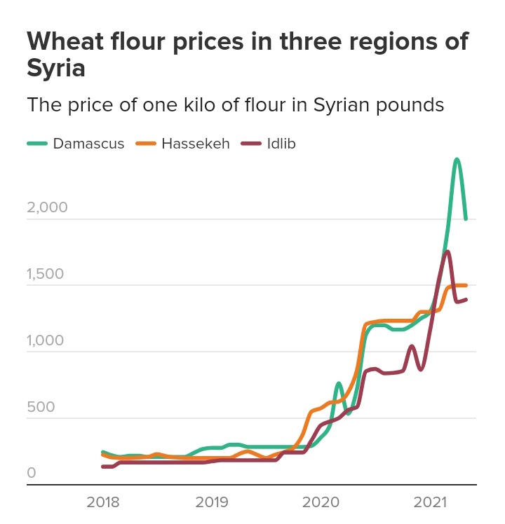 خشکسالی هم موجب شد تا مردم سوریه بیشتر تحت فشار قرار گیرند با این وجود این فشار در مناطق تحت کنترل حکومت بیشتر بود. این در حالیست که دولت علاوه بر واردات، گندم محصول مناطق کردنشین تحت کنترل S.D.F را نیز خریداری میکرد اما بازهم قادر به کنترل قیمت و ارائه نان به میزان کافی نبود.