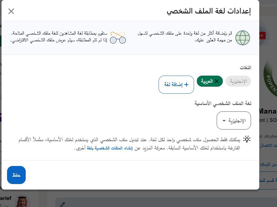 اذا ضغطتوا على زر لغة الملف الشخصي بيطلع لكم اللغات + اللغة الاساسية اللي تبونها تظهر كملف شخصي اساسي اختاروها.