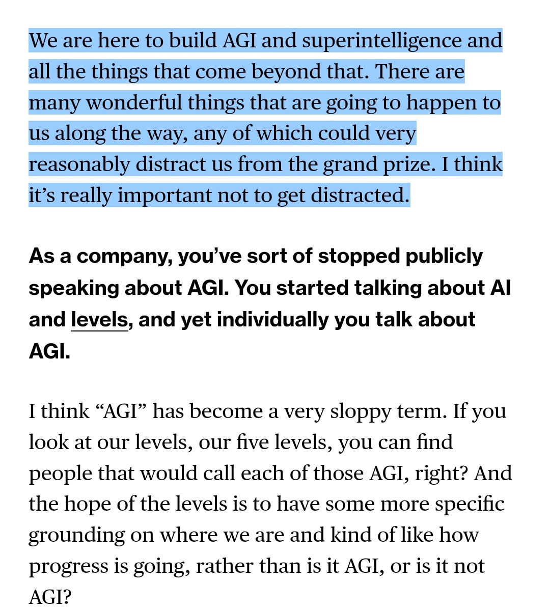 بصفتك شركة، توقفت نوعًا ما عن التحدث علنًا عن الذكاء الاصطناعي العام. لقد بدأت الحديث عن الذكاء الاصطناعي والمستويات، ومع ذلك تتحدث بشكل فردي عن الذكاء الاصطناعي العام.