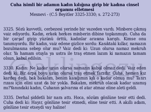 Kadın halâyıkcağızı perişan, şaşkın ve somurtkan, kocasını da namazda görünce bu halden şüphelendi. Derhal kocasının eteğini kaldırdı. Bir de ne görsün? Aleti ve hâyâları meni içinde. Aletinden arta kalan meni damlamada, baldırı dizi pislik içinde. Başına vurdu da dedi ki: “A adi herif, namaz kılan adamın hayaları böyle mi olur? Şu alet, bu çeşit pislik içinde bulunan but ve kasık, Tanrıyı anmaya ve namaza layık mıdır?