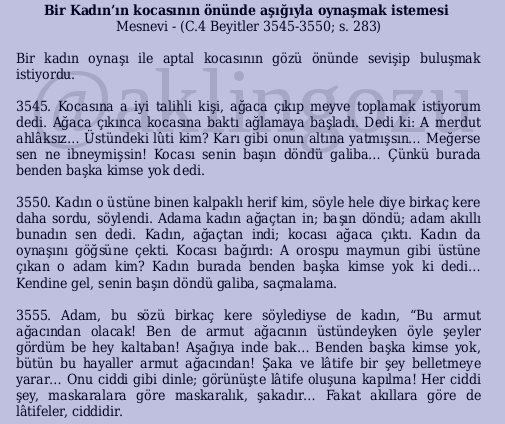 Bir kadın oynaşı ile aptal kocasının gözü önünde sevişip buluşmak istiyordu. Kocasına “A iyi talihli kişi, ağaca çıkıp meyve toplamak istiyorum.” dedi. Ağaca çıkınca kocasına baktı ağlamaya başladı. Dedi ki: “A merdut ahlâksız. Üstündeki lûti kim? Karı gibi onun altına yatmışsın. Meğerse sen ne ibneymişsin!”