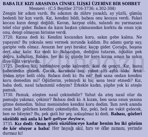 Babası dedi ki: “A kızım, ben sana onun yanına gitme demedim. Yalnız menisinden kendini koru dedim. Tam zevk anında onun beli gelirken kendini çekmeliydin.” Kız, “Peki, beli ne vakit gelecek, ben ne bileyim? Bu, pek gizli bir şey, anlaşılmaz ki.” dedi. Babası, “Gözleri süzüldü mü anla ki beli geliyor.” deyince, Kız dedi: “Onun gözü süzülünceye kadar benim bu iki gözüm de kör oluyor a baba!”