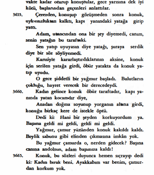 Kadın gelince konuk öbür taraftadır, kapı yanında yatan kocamdır diye, Anadan doğma soyunup yorganın altına girdi, konuğu birkaç kere de istekle öptü.