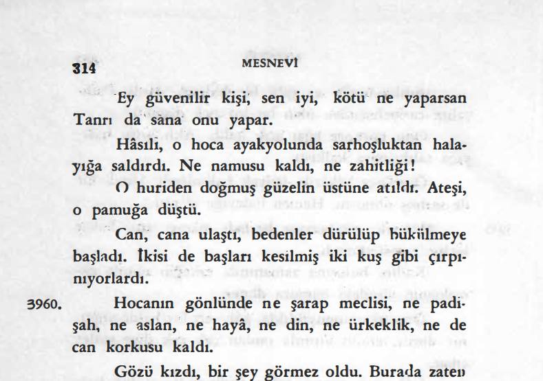 O huriden doğmuş güzelin üstüne atıldı. Ateşi o pamuğa düştü. Can, cana ulaştı bedenler dürülüp bükülmeye başladı. İkisi de başları kesilmiş iki kuş gibi çırpınıyorlardı. Hocanın gönlünde ne şarap meclisi, ne padişah, ne aslan, ne hâyâ, ne din, ne ürkeklik, ne de can korkusu kaldı. Gözü kızdı, bir şey görmez oldu.