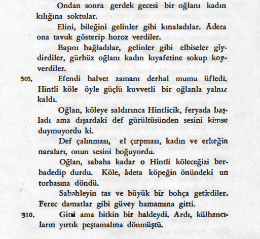 Ondan sonra gerdek gecesi bir oğlanı kadın kılığına soktular. Elini, bileğini gelinler gibi kınaladılar. Âdeta ona tavuk gösterip horoz verdiler. Başını bağladılar, gelinler gibi elbiseler giydirdiler, gürbüz oğlanı kadın kıyafetine sokup koyverdiler. Efendi halvet zamanı derhal mumu üfledi. Hintli köle öyle güçlü kuvvetli bir oğlanla yalnız kaldı. Oğlan, köleye saldırınca Hintlicik, feryada başladı ama dışarıdaki def gürültüsünden sesini kimse duymuyordu ki. Def çalması, el çırpması, kadın ve erkeğin naraları, onun sesini boğuyordu. Oğlan, sabaha kadar o Hintli köleceğizi berbat edip durdu. Köle, âdeta köpeğin önündeki un torbasına döndü. Sabahleyin tas ve büyük bir bohça getirdiler. Ferec damatlar gibi güvey hamamına gitti. Gitti ama bitkin bir haldeydi. Ardı, külhancıların yırtık peştamalına dönmüştü.