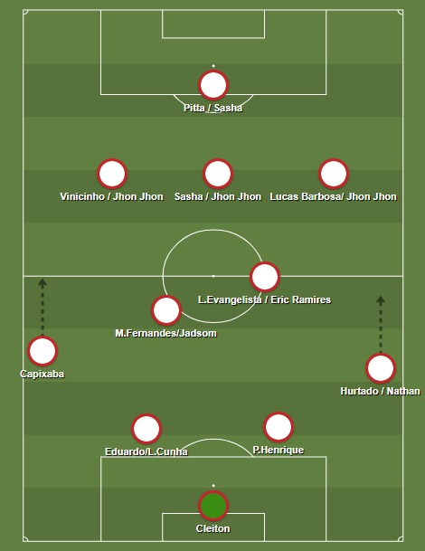 Pitta atuou pelo centro enquanto Lucas Barbosa pelo lado direito do ataque. Pensando nisso e com as chegadas e saídas de jogadores a tendência é que o time passe a ter um 4-2-3-1 sem pontas muito abertos, deixando o corredor mais para os laterais, como no exemplo a seguir. x.com