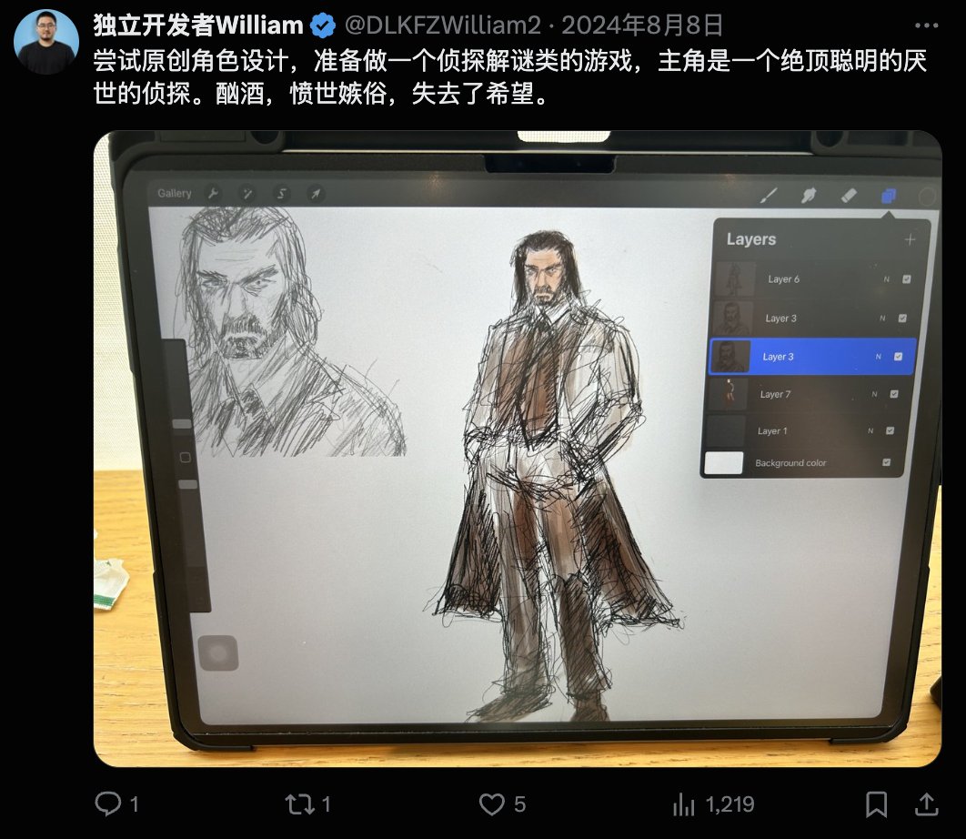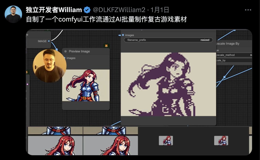 可以看到他过往的推文中通过 ComfyUI 工作流AI批量制作游戏素材,并且开发手机游戏,这正常可是一个游戏工作室几个人的工作量了