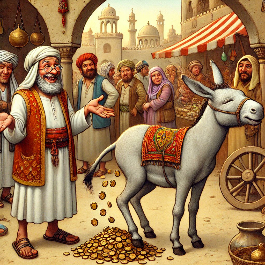 عندما نهق الحمار، هطلت النقود من دبره، فتجمع الناس من حولهما مبهورين. أعلن المحتال للجمع أن الحمار يساقط ذهبًا مع كل نهقة.