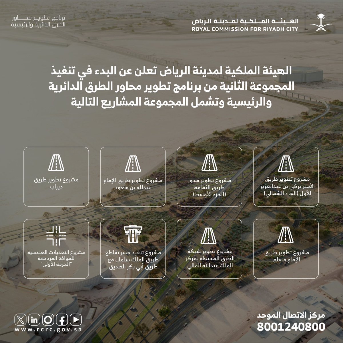 أعلنت الهيئة الملكيّة لمدينة الرياض عن إطلاق المجموعة الثانية من برنامج تطوير محاور الطرق، والتي تشمل تنفيذ 8 مشاريع جديدة، وذلك استكمالًا للمرحلة الأولى التي تم تدشينها في أغسطس الماضي، بتكلفة إجماليّة تتجاوز الـ 21 مليار ريال للمجموعتين.
