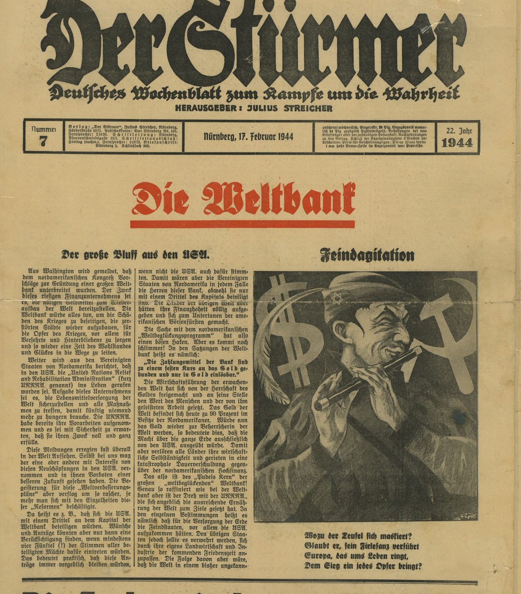 في 17 فبراير من عام 1944 نشرت صحيفة دير شترمر، ألالمانية يهو_دي يعزف على الناي مع وجود علامة الدولار والمطرقة والمنجل في الخلفية، مما يشير إلى أن اليهود كانوا يسيطرون على المؤسسة الشيوعية من خلال المال