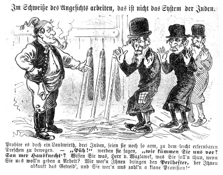كاريكاتيرنُشر في المجلة الساخرة "كيكيريكي" في الثالث عشر من سبتمبر 1883) وتحت عنوان ( إن كسب خبزه بعرق جبينه ليس من نصيب الي_هود"، اي ان الي_هود غير قادرين على العمل البدني وأنهم بدلاً من ذلك يمارسون التجارة على حساب المزارعين والحرفيين. x.com