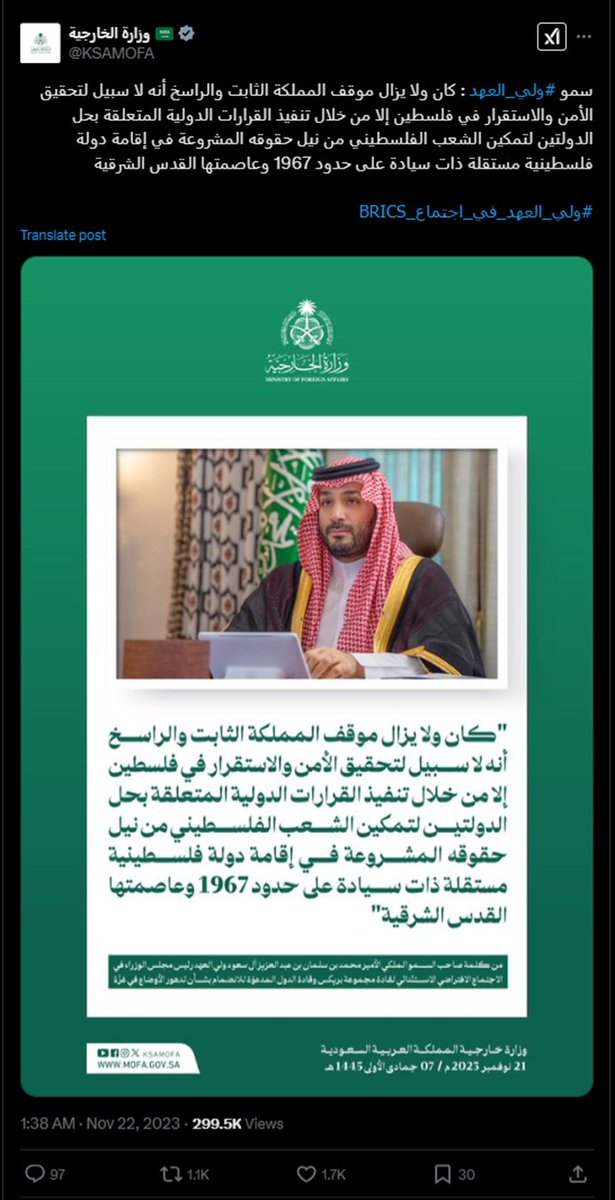 4- مطالبة سمو ولي العهد بإقامة دولة فلسطينية في القمة الخليجية ورابطة الآسيان بتاريخ 20-10-2023