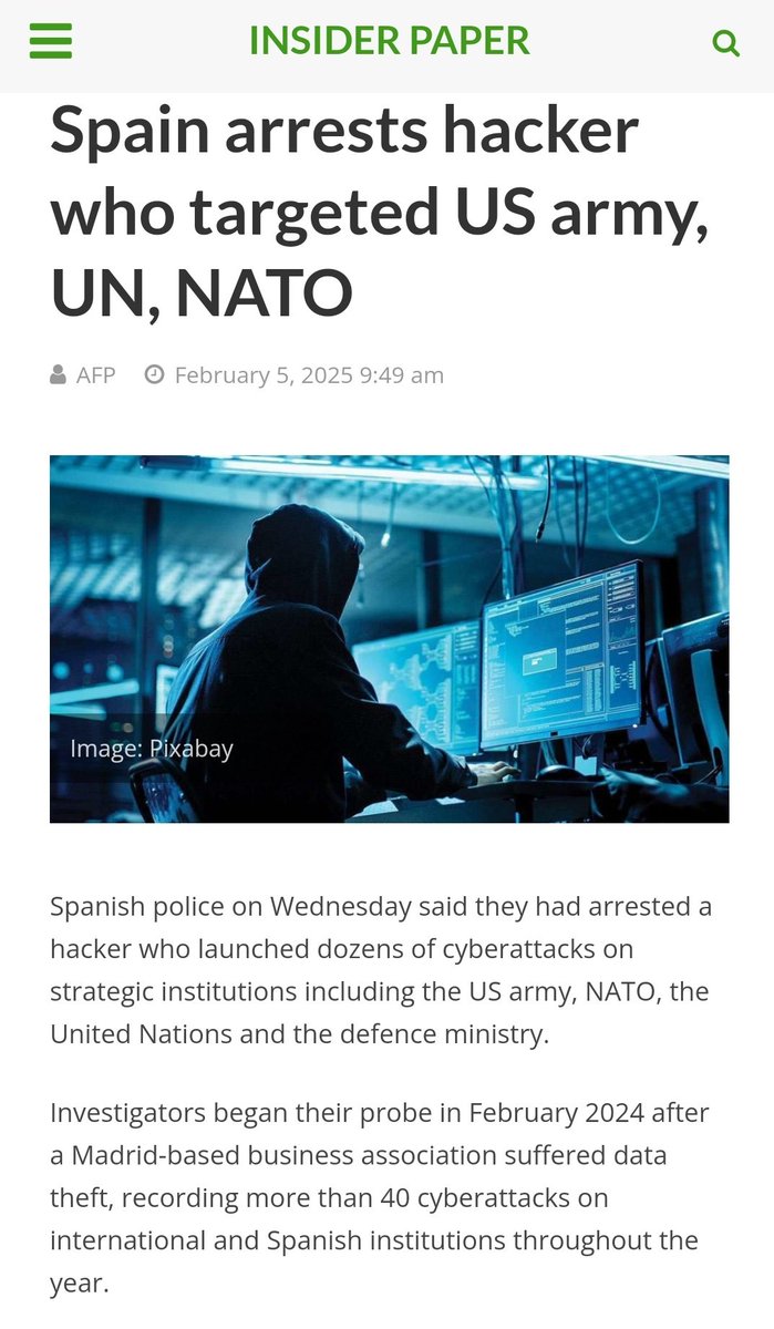 تنفست اجهزة #الامن_السيبراني حول العالم الصعداء بعد القاء #اسبانيا القبض على #هاكر خطير مسؤول عن أكثر من 50 هجوما إلكترونيا وسرقة قواعد بيانات حلف شمال الأطلسي #الناتو والجيش الأمريكي، والامم المتحدة وشركات وكيانات دولية أخرى.