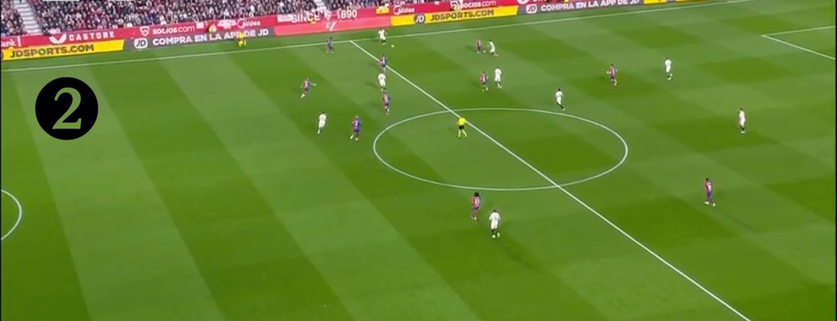 Tras 18 pases, el Barça desajusta a la estructura del Sevilla en el 1-3. Gudelj pierde posición y Pau Cubarsí filtra un gran pase para Raphinha, que aparece por sorpresa donde más daño hace y se saca disparo desde fuera del área (gol muy parecido al conseguido vs UDL) x.com