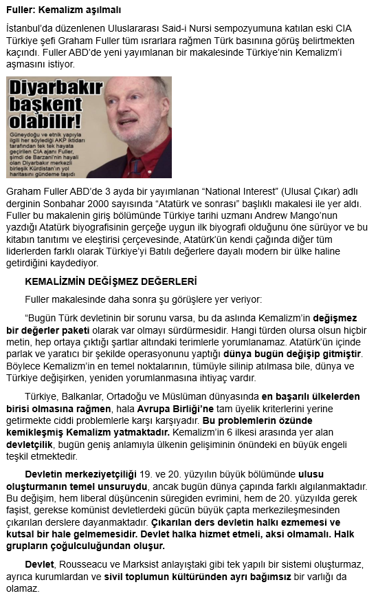 3) CIA’nın eski Ortadoğu Masası Şefi Graham E. Fuller, 2007’de "Yeni Türkiye Cumhuriyeti" adlı bir kitap yazdı. Fuller kitabında, Türkiye’nin Ortadoğulu olduğunu belirterek, yönünü Batı’ya çevirdi diye Atatürk‘ü eleştiriyor.