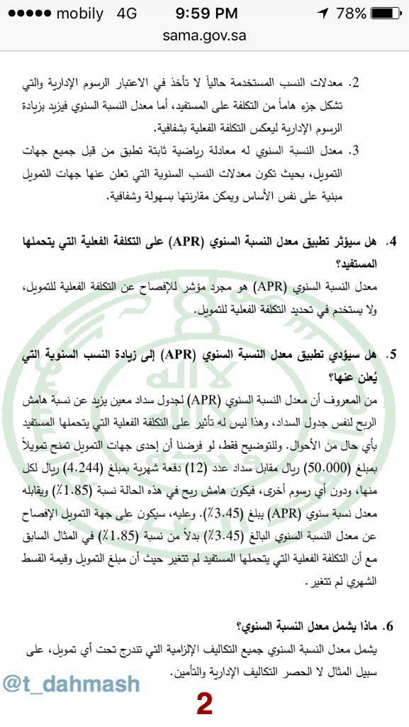 استفسارات مهمة لتوضيح ”معدل النسبة السنوي APR“ في جميع عقود التمويل (الشخصي والعقاري)..