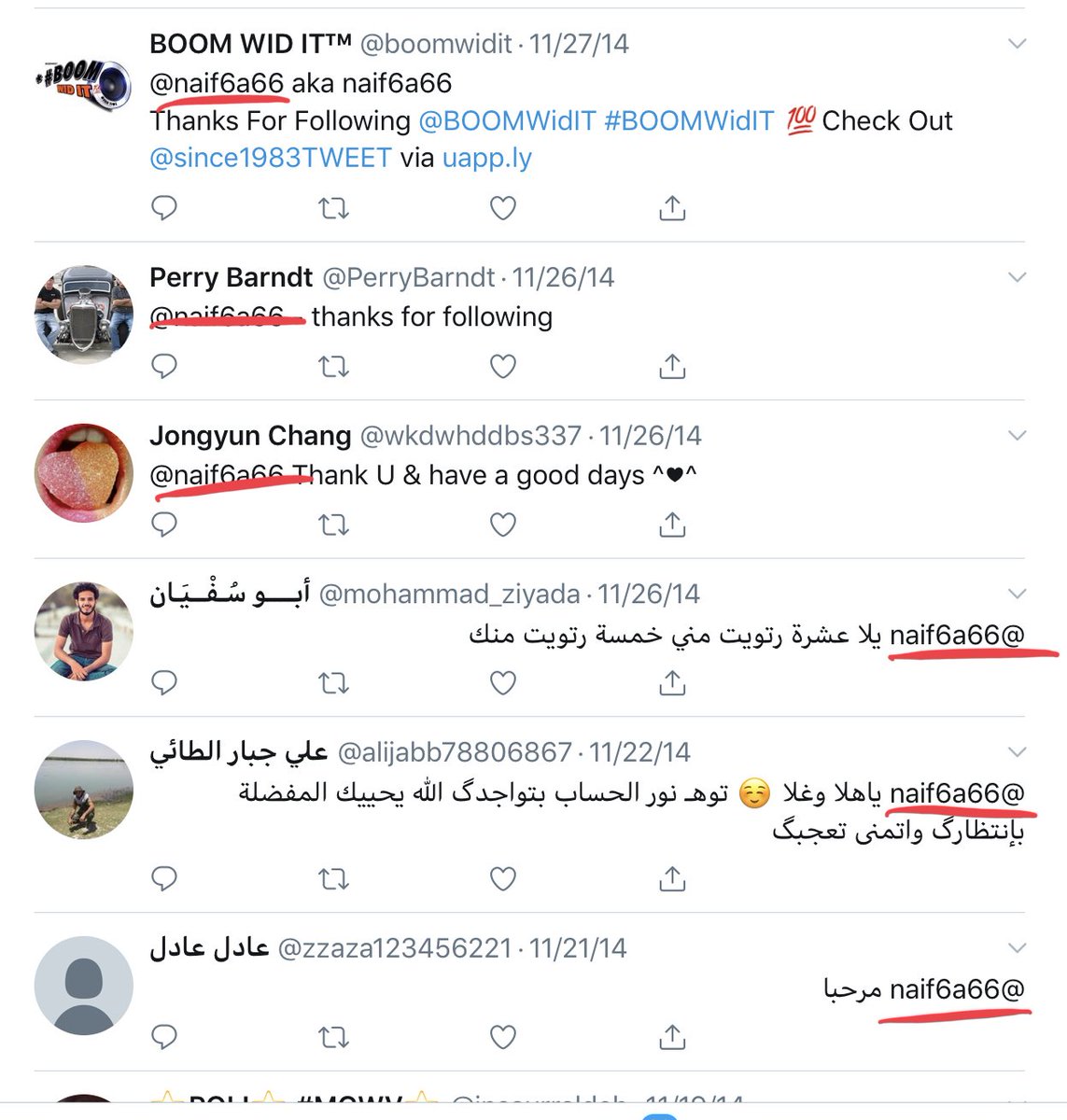 بعضها بتواريخ تسجيل ٢٠١٢، احتمال انها حسابات مهكرة.