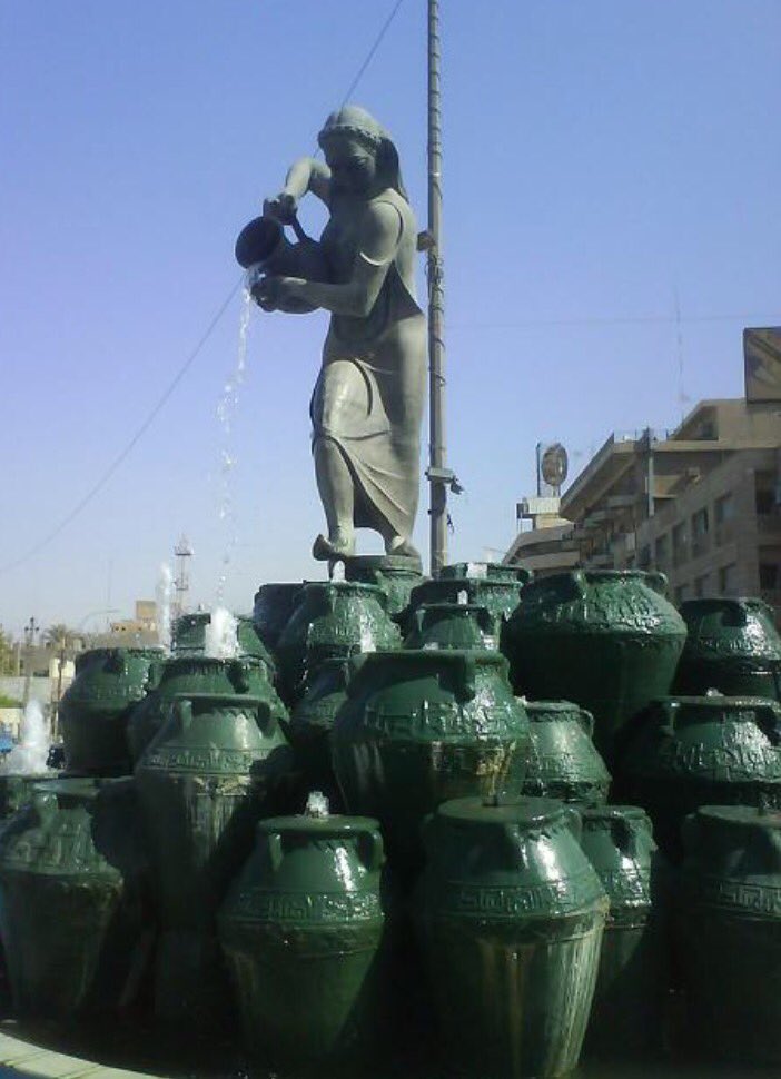 في المخيال البغدادي. يبلغ التمثال غاية أبهته إذا أنيرت الأضواء ونزلت المياه في الجرار دلالةً على استمرار الحياة. عانى التمثال من البِلى =