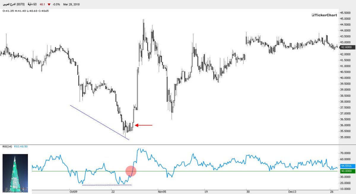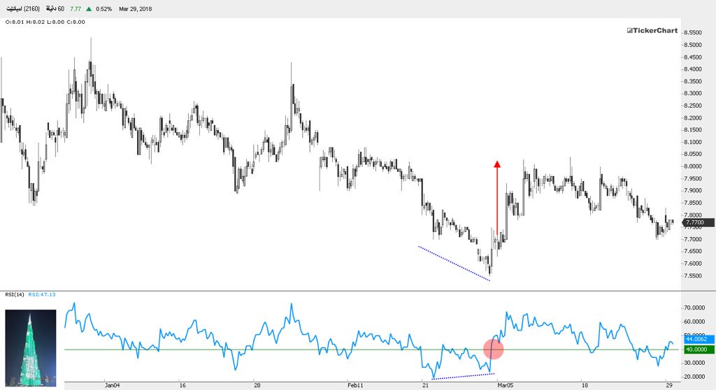 من متابعتي الدايفرجنسي وجدت ان افضل طريقة لفترة الاسهم واقتناص الديفر الإيجابي هي تجاوز مستوى ٤٠ في RSI وهذي معادلته (