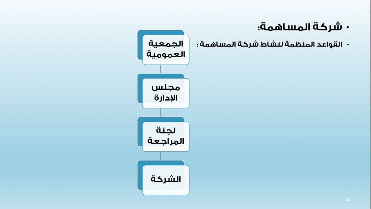 شركةالمساهمة:رأس مالها مقسم إلى أسهم متساوية القيمةوقابلة للتداول،وتكون الشركة وحدها مسؤولة عن الديون والالتزامات المترتبة على ممارسة نشاطها