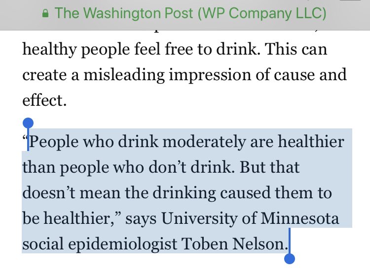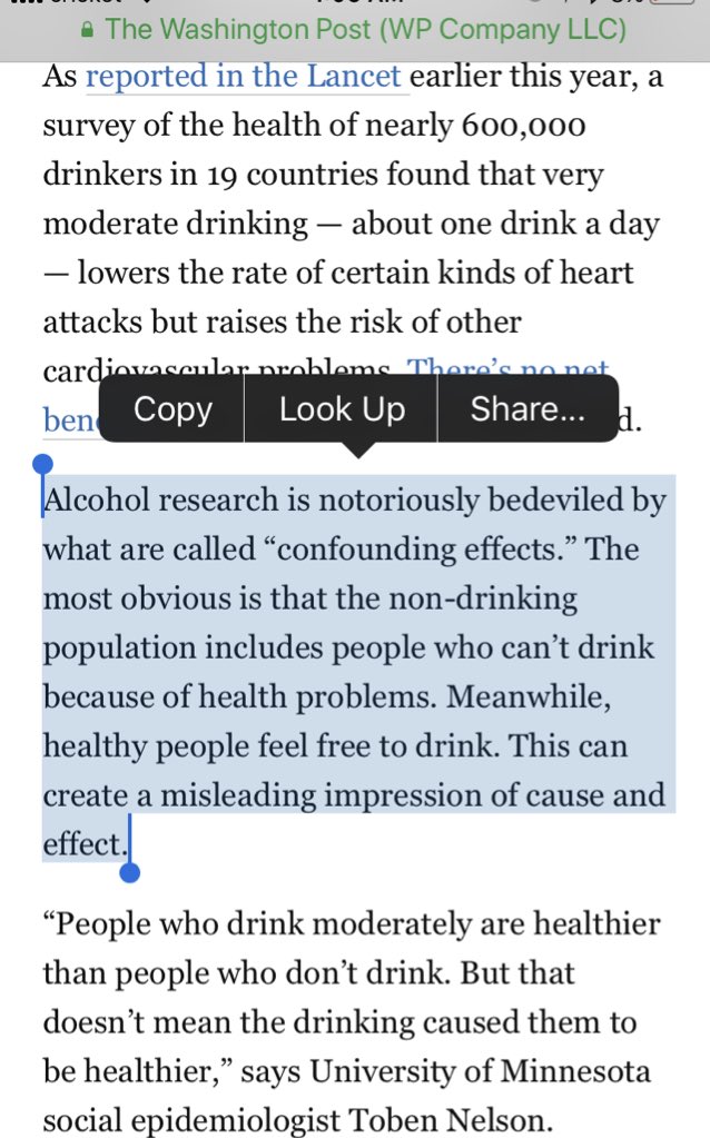٤٨/ مقال عجيب في جريدة واشنطن بوست بعنوان "انهيار تجربة سريرية ضخمة، ويبقى البحث عن الكحول مشوشاً" يستهل في بدايته بأنه لا شك حول ضرر شرب الكحول كأساً بعد آخر ولكن يصبح الأمر معتماً حين نأتي ل "الشرب المعتدل"