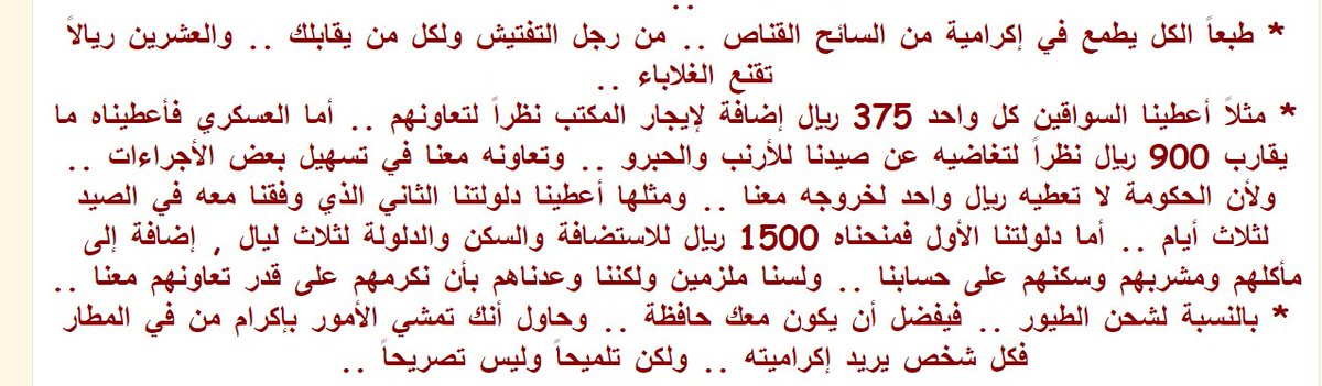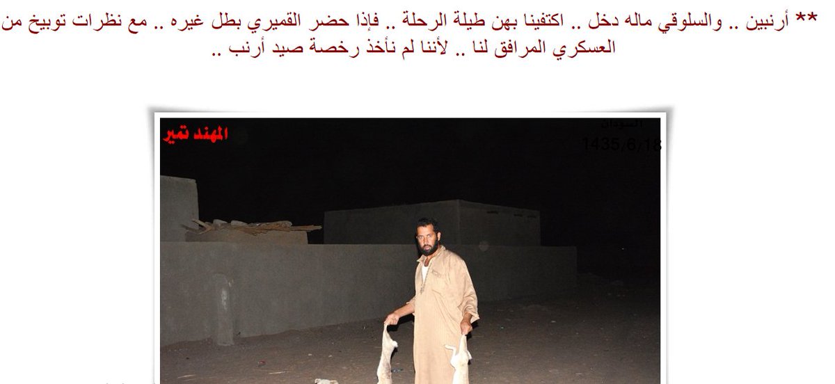 وعشان الرشايدة ما يزعلو انا كتبت كلام اتكتب في التقرير الانا قريتو وصاحبو كاتب انو ساعدوهم في شراء الطلقات والاسلحة ودا ما تعميم بس شي حصل ومصور ونواصل بالنسبة للمخالفات لما يلقو مخالفة طوالي بيصادرو الحاجة وحسب نوع الحيوان بيكون في غرامة وسجن بس بيعملو تسوية ويدفعو ويشيلوها