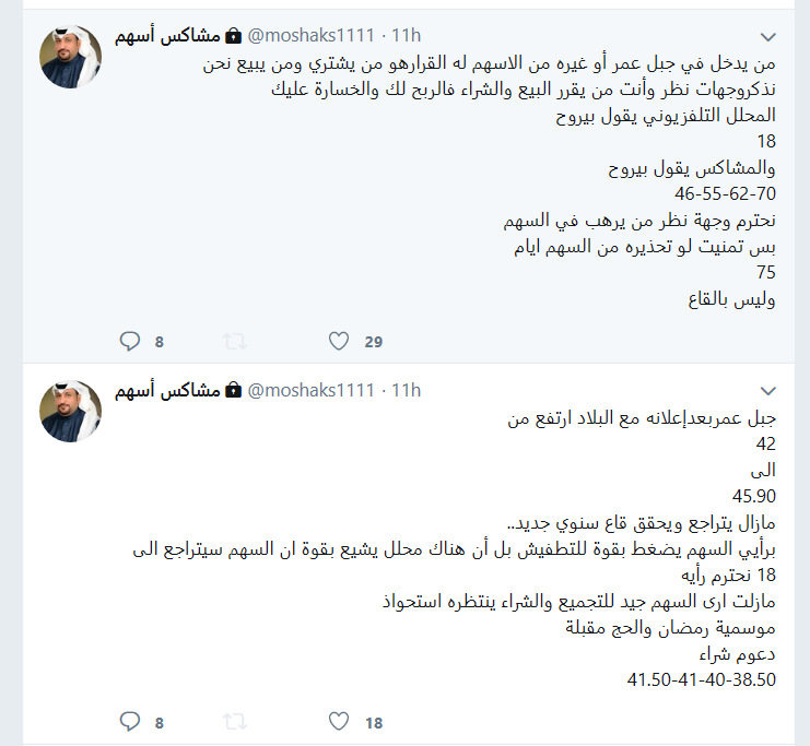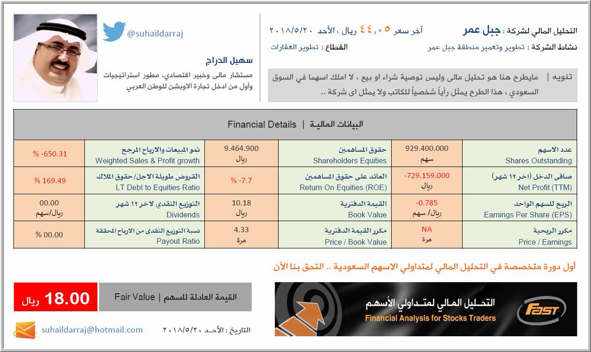#القيمة_العادلة لشركة #جبل_عمر بعد اعلان نتائج الربع الاول 2018 هي 18.00ريال فقط (خسائر ، تراجع حاد في النمو ، خطورة القروض ، تقييم مبالغ به) ، أخر سعر للسهم الأحد 2018/5/20 هو : 44.05 ريال