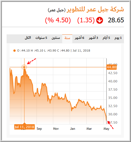 قبل سنة تقريبا تم تحليل #جبل_عمر تحليلاً مالياً وكان يومها عند النقطة المشار اليها في الرسم ، ولا زال السهم يحقق الأدنى منذ ذاك اليوم ، واخر اغلاق له اليوم الاحد 2019/5/12 هو 28.65 ريال .. شكرا للتحليل المالي الذى انقذ الكثير، ولا عزاء للمشككيين والهوامير والمتنفذين ومن لف لفيفهم